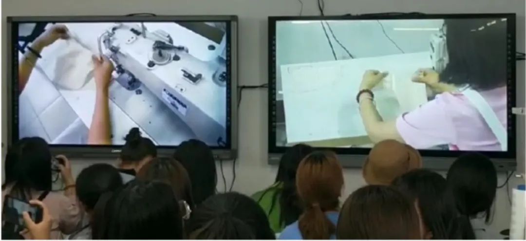 實訓(xùn)推車同時支持畫面的線上實時直播,學(xué)生們在不同教室也能夠與老師同屏互動對話,甚至是在校外的學(xué)生通過手機、電腦等移動終端,也能在遠端近距離觀看、學(xué)習(xí)老師的針織手法,沉浸式體驗課堂的點滴精彩!