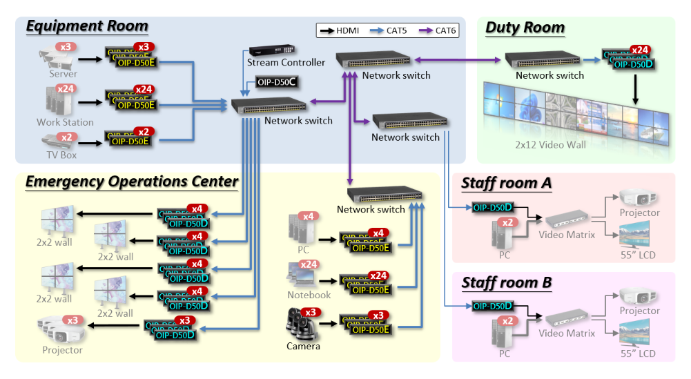 交通控制中心采用 Lumens OIP-D50 系列 AV over IP 系統(tǒng)作為視頻傳輸?shù)暮诵脑O備,提供了 4K 和超高清信號的遠距離傳輸,并支持跨多個房間的視頻監(jiān)控。OIP 系列支持輸出到控制中心的 2x2 和 12x2 視頻墻和運營中心的多視圖顯示器,以及對部門服務器的 KVM 控制。使用 OIP-D50C 裝置,管理人員可以實時控制信號路由和每個視頻墻的布局。他們還能夠在多個顯示器上縮放單個源。