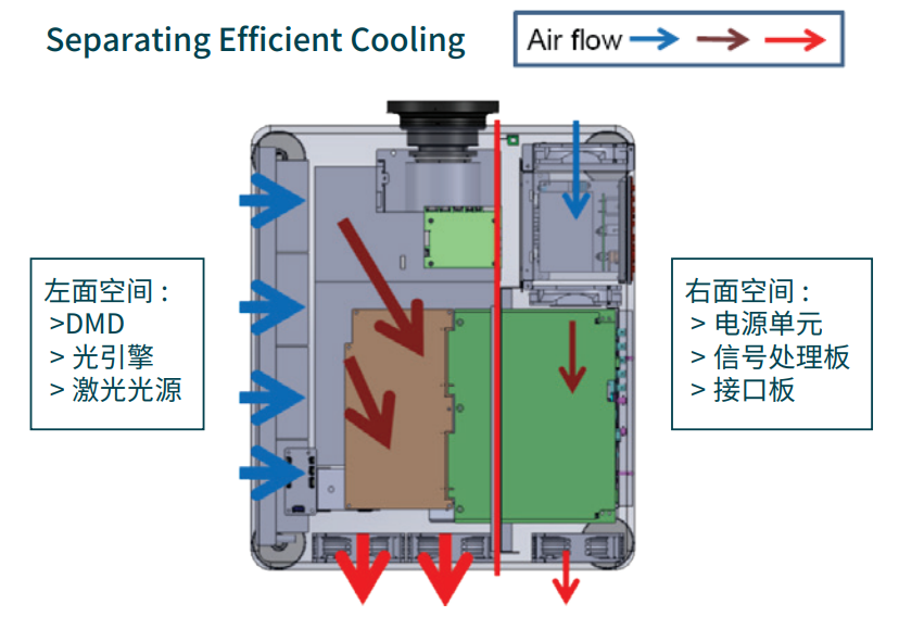 散熱系統(tǒng)是保證投影機穩(wěn)定工作的基礎(chǔ)。散熱系統(tǒng)設(shè)計不良的話,投影機的穩(wěn)定性會大打折扣。PX2201UL+采用全分離式氣流散熱系統(tǒng),通過左右兩個獨立的散熱通道,將發(fā)熱大戶光路部分與熱量較少的電路部分隔離開來。在發(fā)熱量最高的激光光源和DMD芯片上,分別采用激光光源液冷技術(shù)和珀耳帖液冷散熱技術(shù)有針對性地進行高效冷卻。如此一來,不僅核心部件的散熱效率得以顯著提升,還能有效降低電路部分的熱量與灰塵量,減少電路故障,大大延長電路壽命。