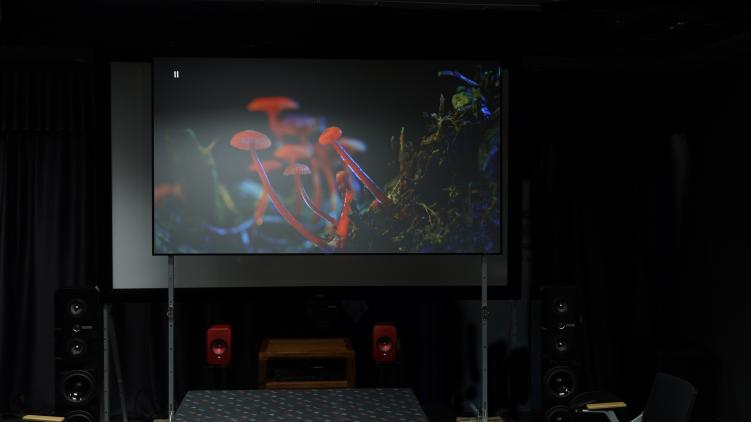 當(dāng)然,兩者更大的不同在于,視聽室這塊投影幕只是普通的白幕,而XY黑晶微孔抗光幕同時(shí)集成了抗光和透聲兩大特性。它采用進(jìn)口PVC為基材,表面用獨(dú)特黑晶抗光涂料制成(這是其幕面呈深灰色的原因),可以有效吸收環(huán)境光和燈光,提升畫面亮度,因此具備優(yōu)秀的抗光干擾能力。