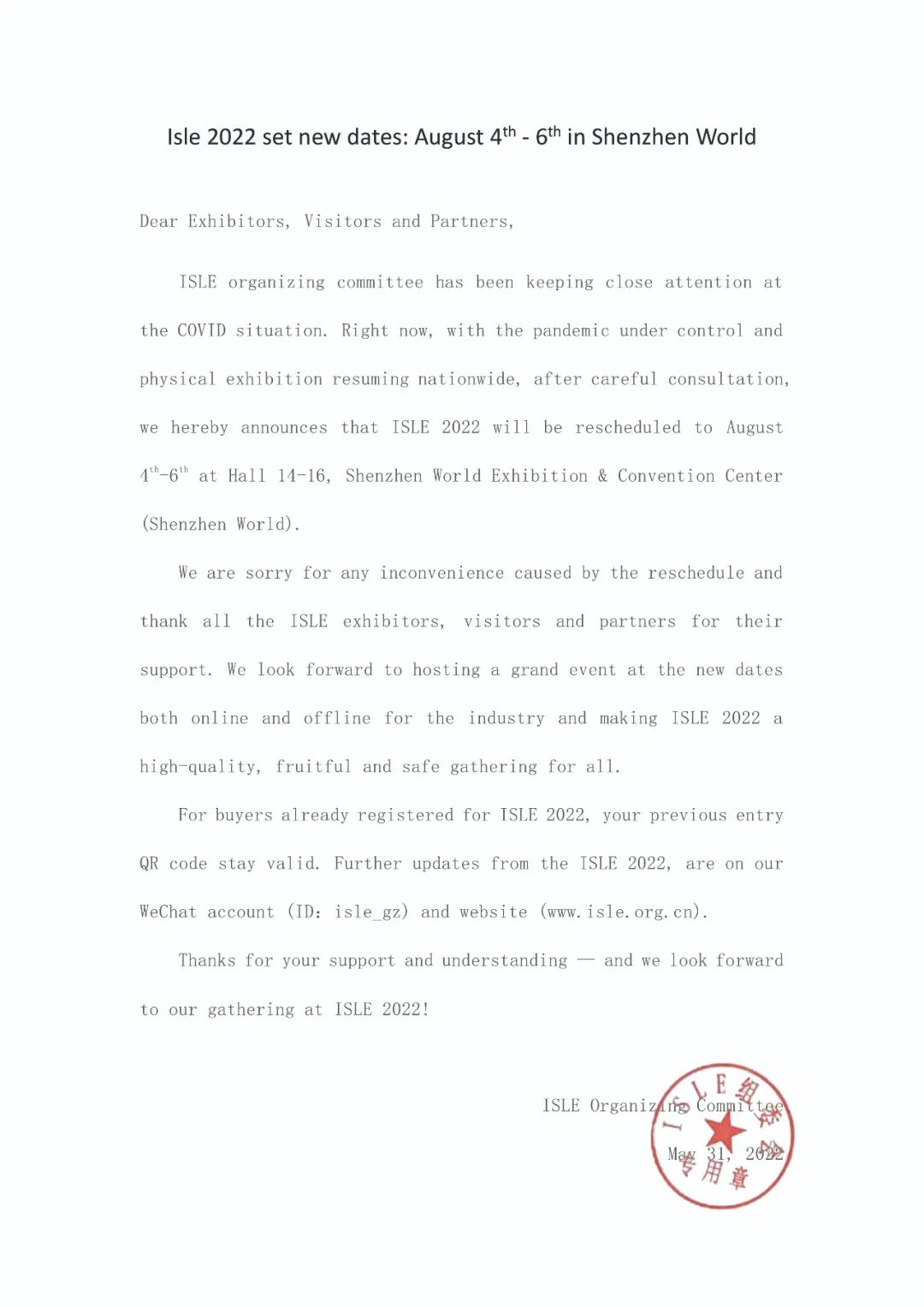ISLE organizing committee has been keeping close attention atthe COVID situation. Right now, with the pandemic under control and physicalexhibition resuming nationwide, after careful consultation, we hereby announcesthat ISLE 2022 will be rescheduled to August 4th-6th atHall 6- 8, Shenzhen World Exhibition & Convention Center (Shenzhen World).