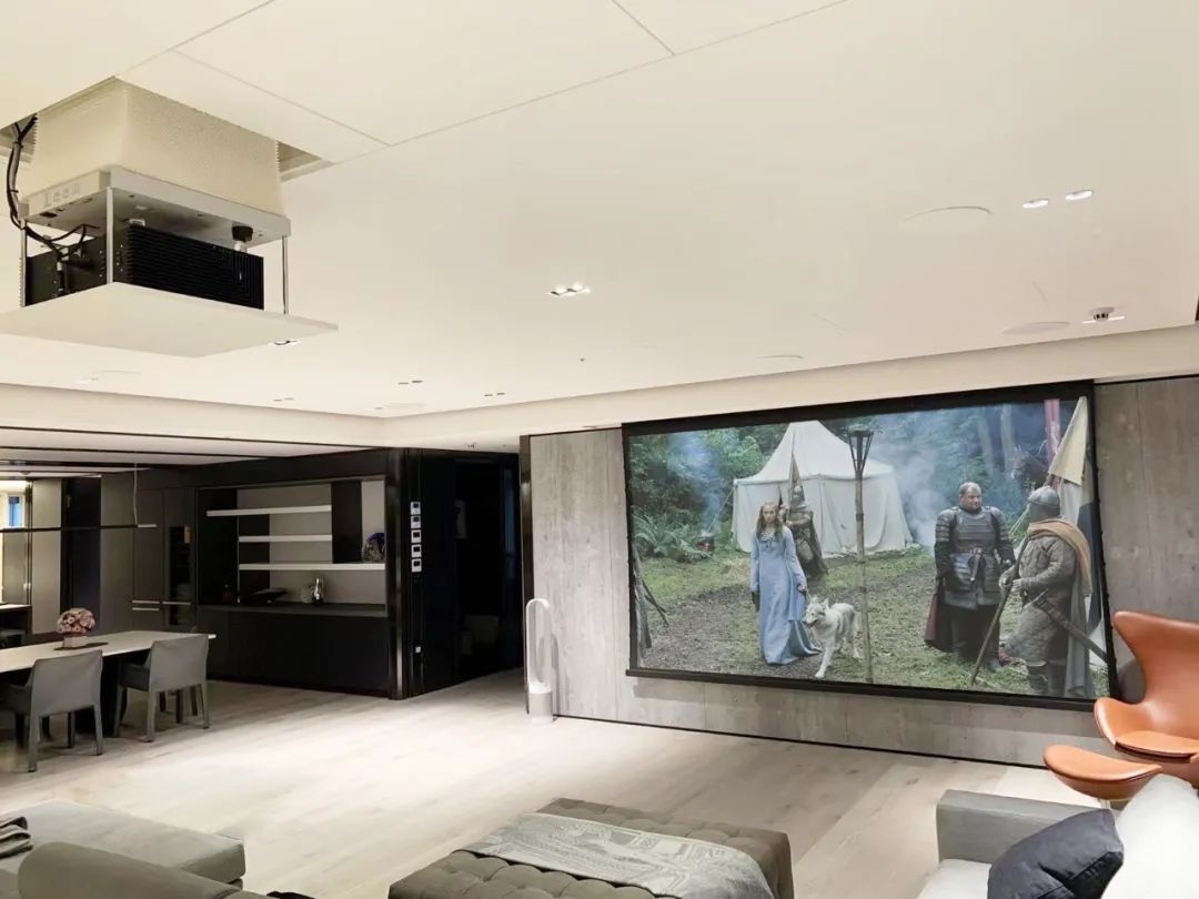 臺灣客戶安裝案例,將Domino4隱藏式吊頂,它完全可以滿足客廳影院的視聽需求,隱藏幕布和投影機(jī)之后的客廳格局清晰利落。