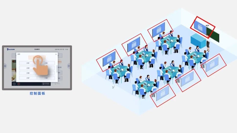 老師示范講解時,可通過屏幕廣播按鈕將課件廣播給全部小組屏,讓教室每一個角落的學(xué)生都能清晰地看到課件內(nèi)容。