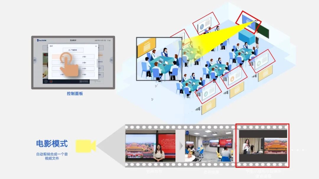 從講臺授課、板書課件、師生問答互動,到學(xué)生研討交流,銳取錄播系統(tǒng)全自動跟蹤課堂全場景、多角度的畫面,還原記錄教室?guī)瑤毠?jié)!
