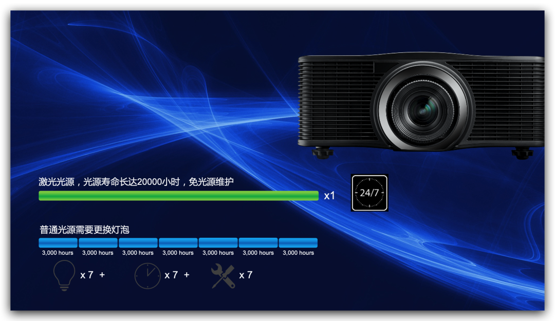 CUL15K采用激光光源,壽命長(zhǎng)達(dá)20000小時(shí),穩(wěn)定持久,是一般投影機(jī)燈泡壽命的6-10倍,基本不需要更換光源,可安心長(zhǎng)效無(wú)憂的使用;采用封閉式光機(jī)設(shè)計(jì),避免灰塵和煙霧附著在光學(xué)元件上而造成損壞或亮度衰減,延長(zhǎng)投影機(jī)使用壽命,減少后續(xù)除塵維護(hù)等費(fèi)用。