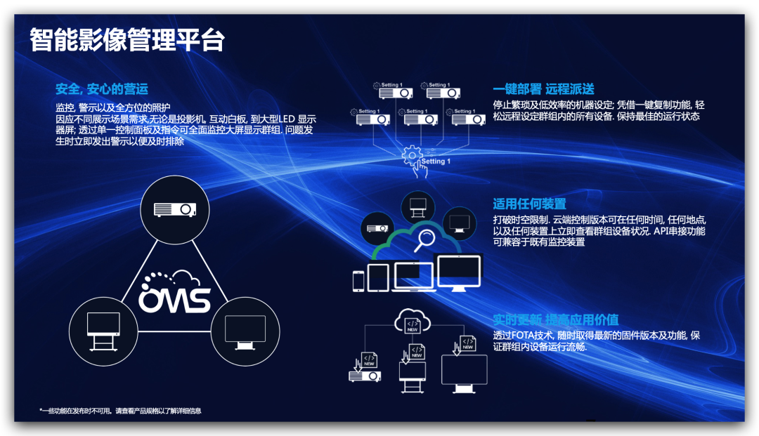 CUL15K采用奧圖碼工程投影機(jī)才具有的智能影像管理平臺(tái),可根據(jù)不同展示場(chǎng)景需求,透過(guò)單一控制面板及指令即可全面監(jiān)控投影機(jī)顯示群組,為用戶提供包括監(jiān)控、警示的全方位管理,發(fā)生問(wèn)題時(shí)立即發(fā)出警示,提醒工程人員及時(shí)排除。