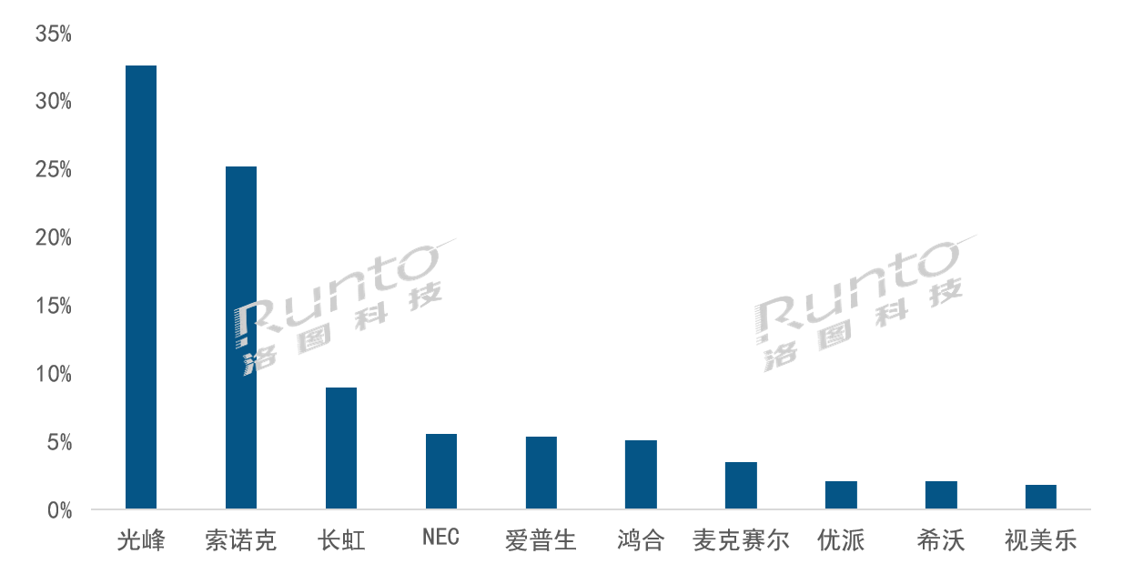 教育市場(chǎng)出貨量完成2.6萬(wàn)臺(tái),同比下降7.4%。一方面原因來(lái)自于,盡管?chē)?guó)家和各省對(duì)教育的支出持續(xù)增加,但資源持續(xù)向軟件和平臺(tái)內(nèi)容而非硬件傾斜。另一方面是來(lái)自競(jìng)品交互平板的市場(chǎng)壓力,液晶交互平板、智慧黑板憑借其便捷的交互功能搶占了不少市場(chǎng)份額。從品牌格局來(lái)看,國(guó)產(chǎn)品牌表現(xiàn)較好;光峰、索諾克深耕教育市場(chǎng),兩品牌市占總和高達(dá)57.8%。鴻合、希沃市場(chǎng)下降明顯,份額跌至5.1%和2.1%。