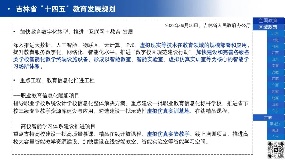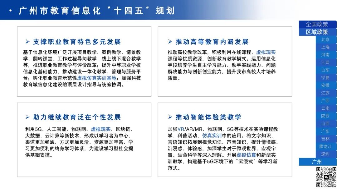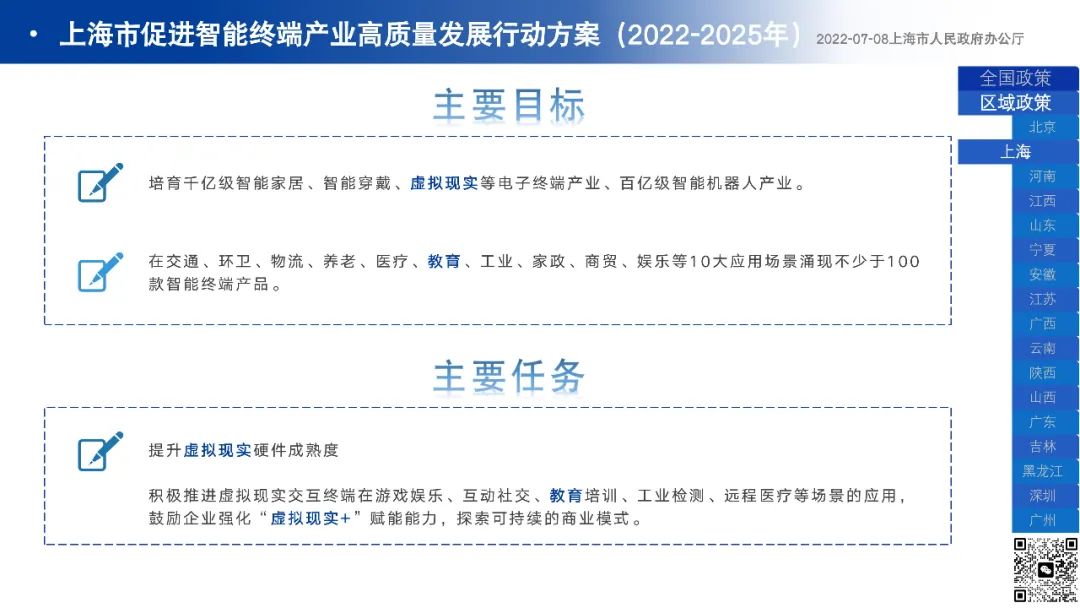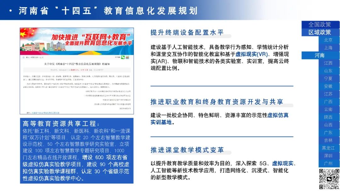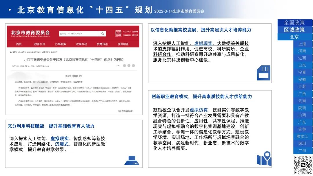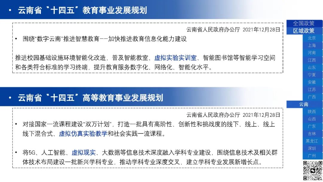 2021-2022年我國大部分省市出臺了關(guān)于元宇宙教育、虛擬現(xiàn)實教育的相關(guān)政策,結(jié)合5G、人工智能、超高清視頻和云計算等新一代信息技術(shù),推進(jìn)“新一代信息技術(shù)+VR”產(chǎn)業(yè)協(xié)同發(fā)展,催生出“5G+VR”、“AI+VR”和“超高清視頻+VR”等特色教學(xué)方式,全面推動教育智能化發(fā)展。旨在加快虛擬現(xiàn)實等新技術(shù)在基礎(chǔ)教育、職業(yè)教育等不同教育階段的應(yīng)用,支持建設(shè)新型虛擬仿真實訓(xùn)基地、產(chǎn)教融合智慧平臺,推動思政、科普、培訓(xùn)、教學(xué)、科研的融合發(fā)展。