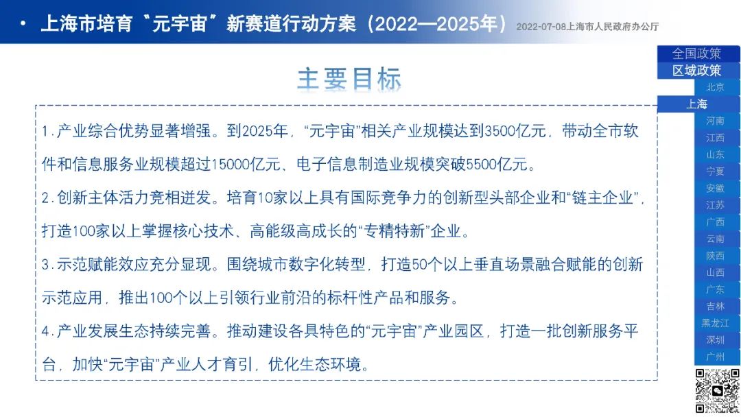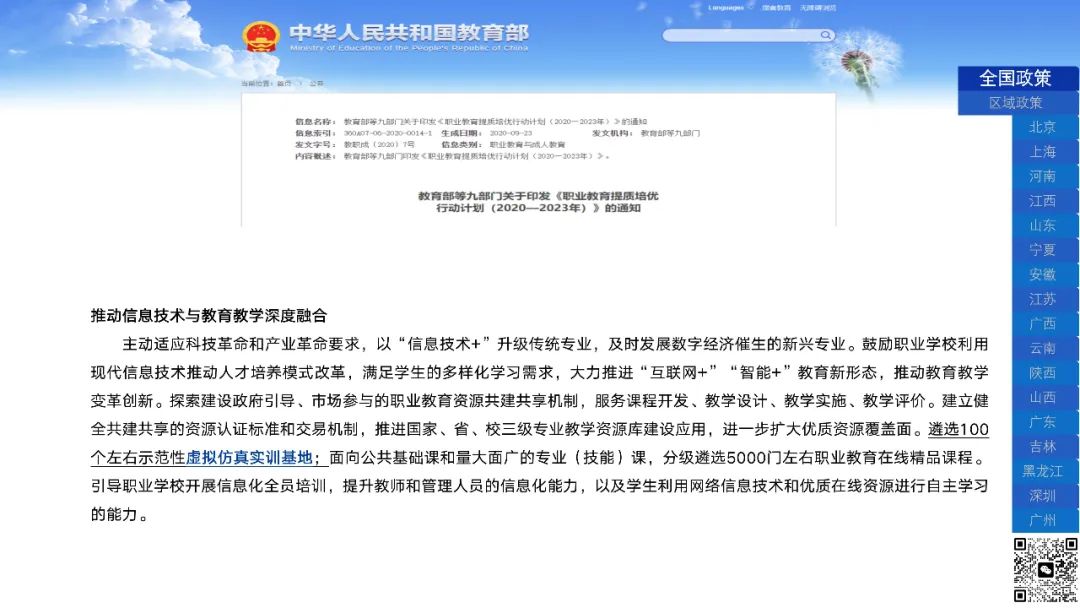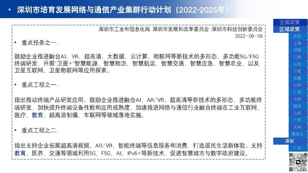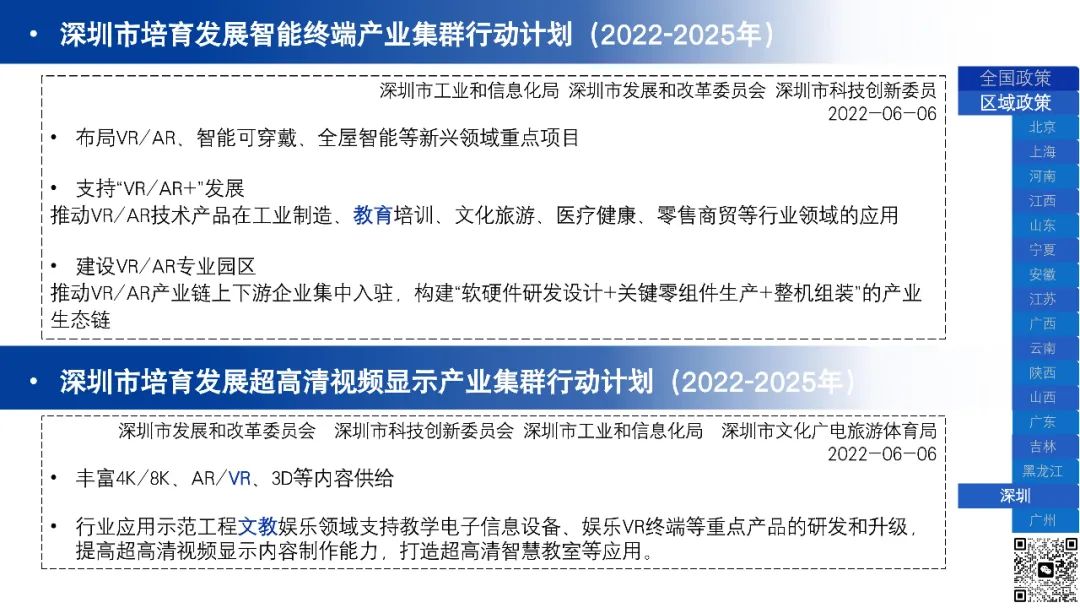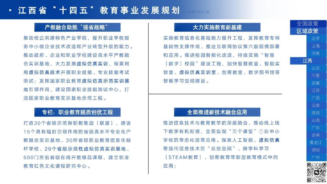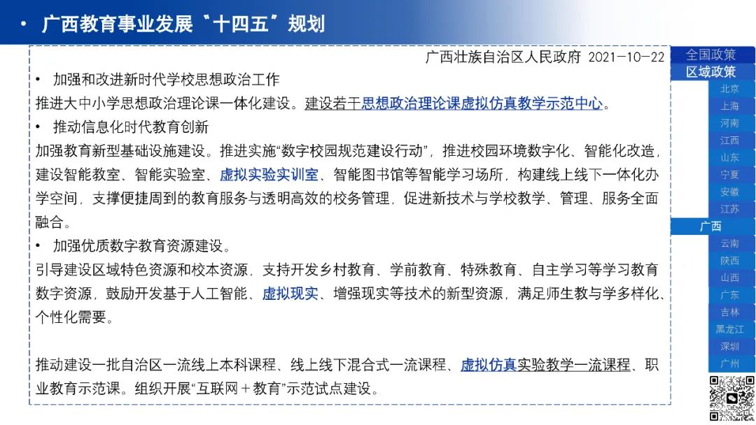 2021-2022年我國大部分省市出臺了關(guān)于元宇宙教育、虛擬現(xiàn)實教育的相關(guān)政策,結(jié)合5G、人工智能、超高清視頻和云計算等新一代信息技術(shù),推進(jìn)“新一代信息技術(shù)+VR”產(chǎn)業(yè)協(xié)同發(fā)展,催生出“5G+VR”、“AI+VR”和“超高清視頻+VR”等特色教學(xué)方式,全面推動教育智能化發(fā)展。旨在加快虛擬現(xiàn)實等新技術(shù)在基礎(chǔ)教育、職業(yè)教育等不同教育階段的應(yīng)用,支持建設(shè)新型虛擬仿真實訓(xùn)基地、產(chǎn)教融合智慧平臺,推動思政、科普、培訓(xùn)、教學(xué)、科研的融合發(fā)展。