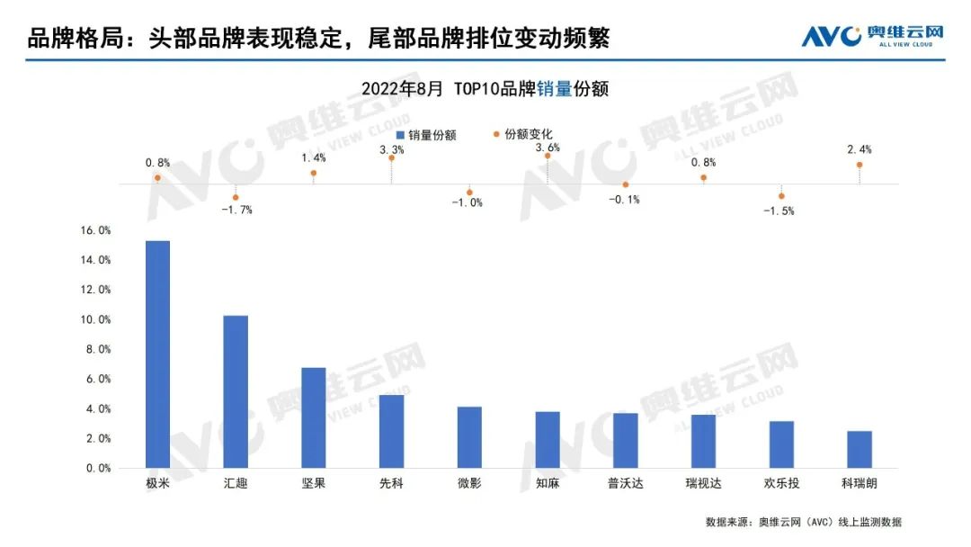 根據(jù)AVC線上監(jiān)測(cè)數(shù)據(jù)顯示,8月在售品牌數(shù)量150+,較去年同期增加約40家,TOP10品牌份額合計(jì)58%,環(huán)比上月微增,但較去年同期下降了9%。TOP5品牌排名穩(wěn)定,但以?xún)r(jià)換量的尾部品牌排位變動(dòng)頻繁,他們憑借價(jià)格優(yōu)勢(shì)迅速回歸市場(chǎng)前列,品牌集中度進(jìn)一步下降。