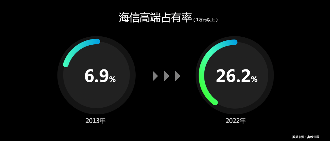奧維數(shù)據(jù)顯示,從2013年第一代ULED電視上市以來(lái),海信在1萬(wàn)+高端市場(chǎng)占有率從2013年的6.9%提升到2022年的26.2%,走出了一道完美的增長(zhǎng)曲線。