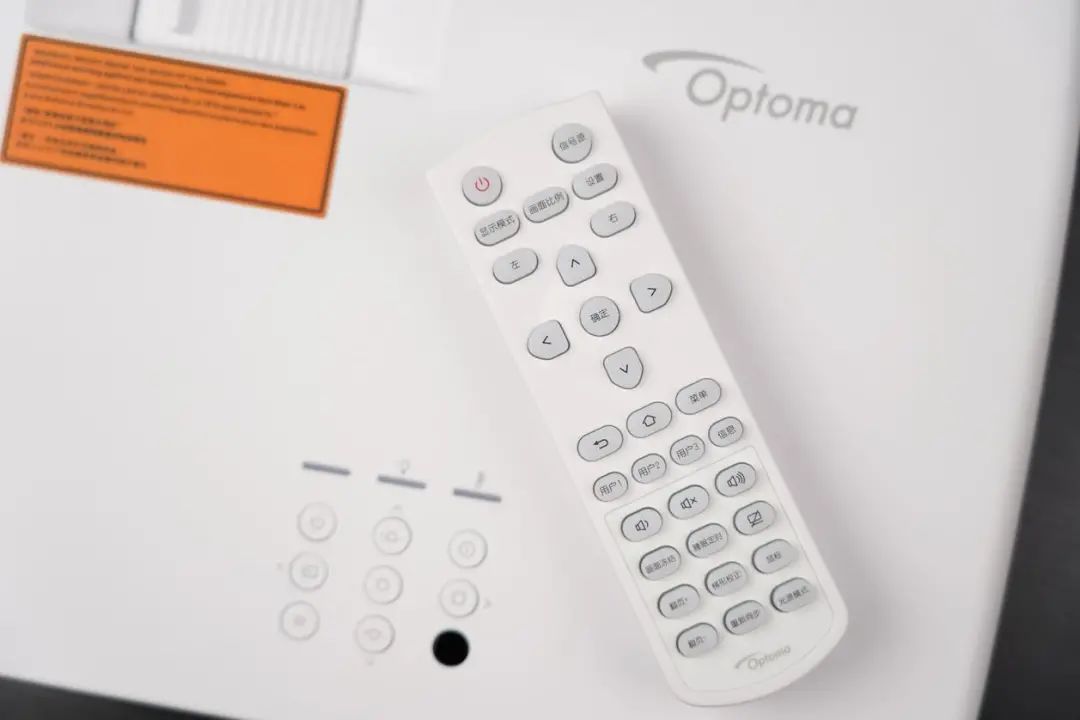 奧圖碼EL360H激光投影機的控制面板位于機身頂部,用戶能非常方便地進行“電源開關(guān)”、“梯形校正”、“音畫輸入”等常用操作?紤]到現(xiàn)代用戶習(xí)慣使用遙控器對設(shè)備進行操作,因此奧圖碼為配套遙控器提供了更豐富的功能,這也方便了吊裝方式的用戶更好地對設(shè)備進行控制。