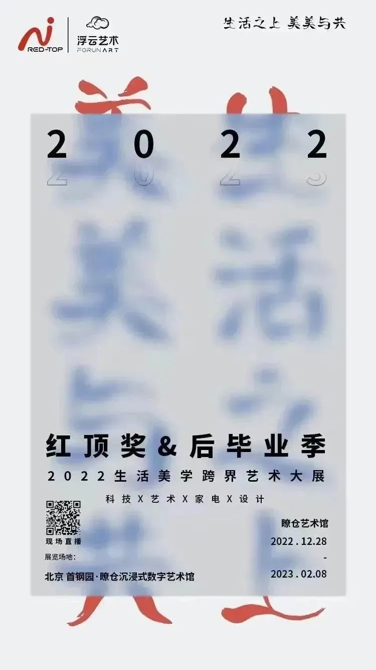 2022年度“紅頂獎”聯(lián)合浮云藝術(shù)、鳳凰網(wǎng)、首鋼園瞭倉藝術(shù)館,共同舉辦“后畢業(yè)季&紅頂獎2022生活美學跨界藝術(shù)大展”,首次將代表中國高端智能家電的產(chǎn)品引進美術(shù)館,展現(xiàn)中國藝術(shù)的新生力量和創(chuàng)造力。以新科技、新設計、新智造、新生活構(gòu)建全新的跨界展示空間,呈現(xiàn)一場“生活之上 美美與共”的生活美學跨界藝術(shù)盛宴。
