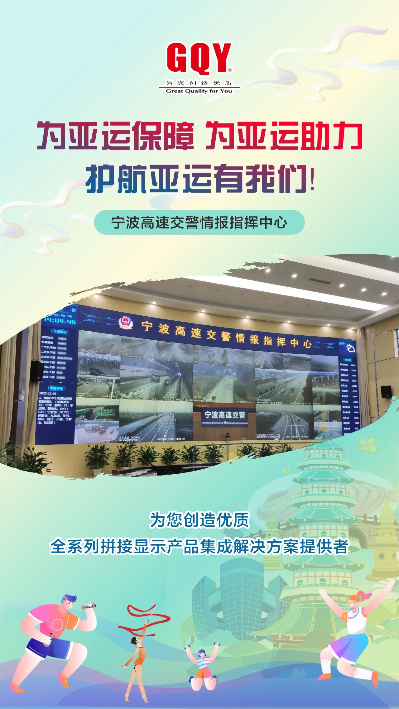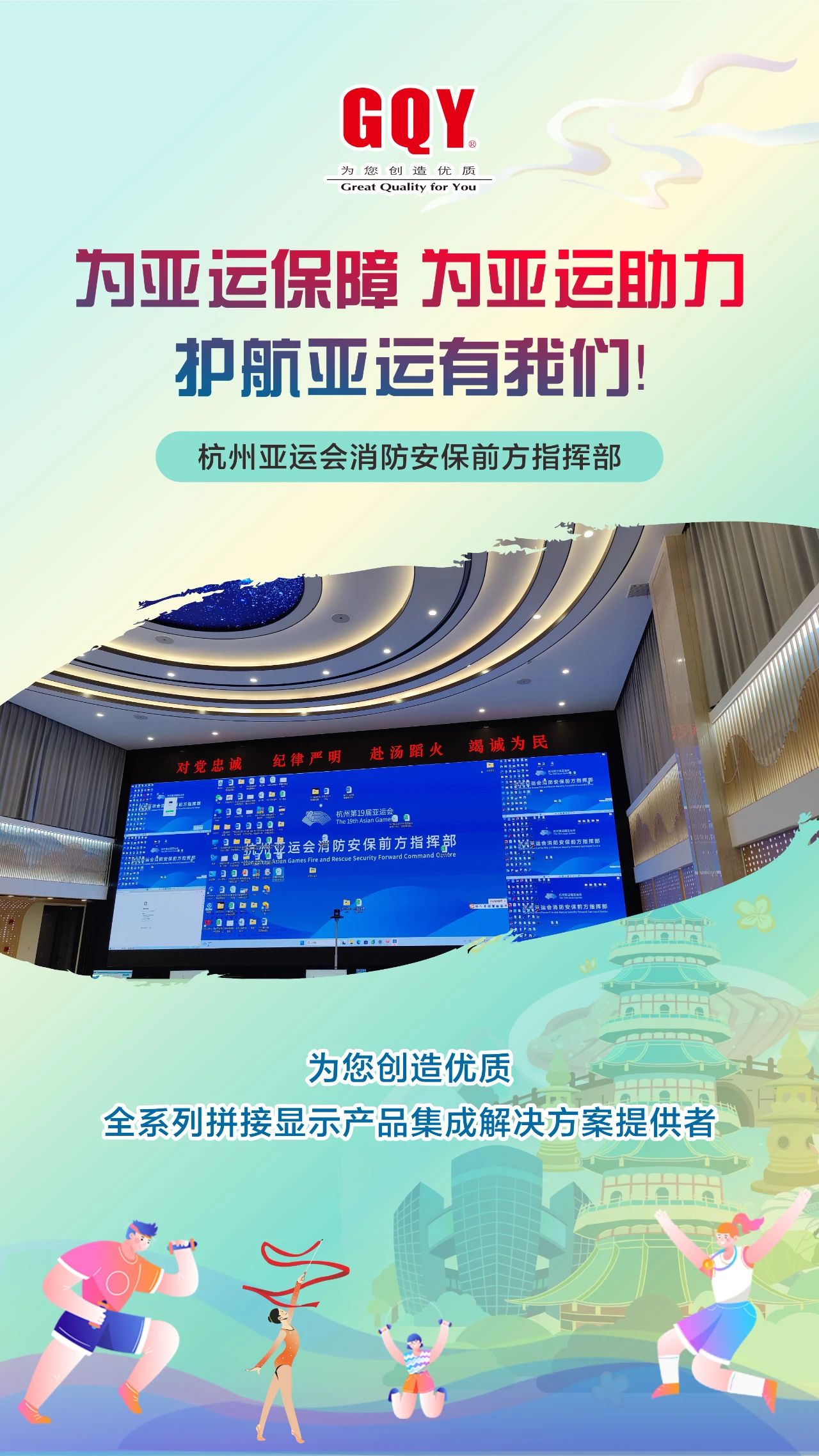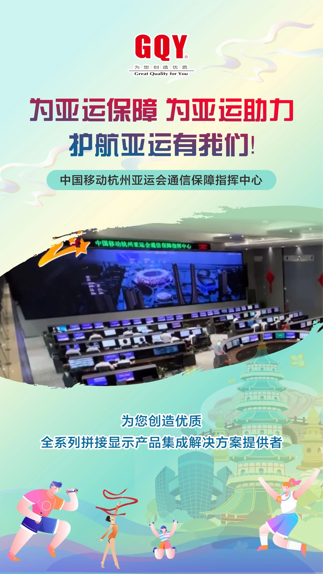 潮涌迎盛會,金秋共亞運(yùn)。象征著亞洲大團(tuán)結(jié)的體育之火在西子湖畔、東海之濱舞動燃起,2023年9月23日,一場萬眾矚目的體育盛會,一場炫目璀璨的文化盛宴在杭州激情開幕。精彩舞臺搭就,八方賓客抵達(dá),杭州,這座千年文化名城在數(shù)智化力量的加持下,正以嶄新的面貌迎接全球賓客。機(jī)場站樓、軌道地鐵、西子湖邊、錢塘江畔、大運(yùn)河旁、街頭巷尾接待了數(shù)以萬計(jì)來自亞洲各地的賓朋、運(yùn)動員、觀眾和游客。作為一家曾為杭州軌道交通、移動通訊、消防安保、城市商顯等各行各業(yè)深度賦能、提供過專業(yè)高清大屏顯示解決方案的視訊企業(yè),GQY視訊護(hù)航助力亞運(yùn)會,在亞運(yùn)會召開期間全力做好后方保障工作。