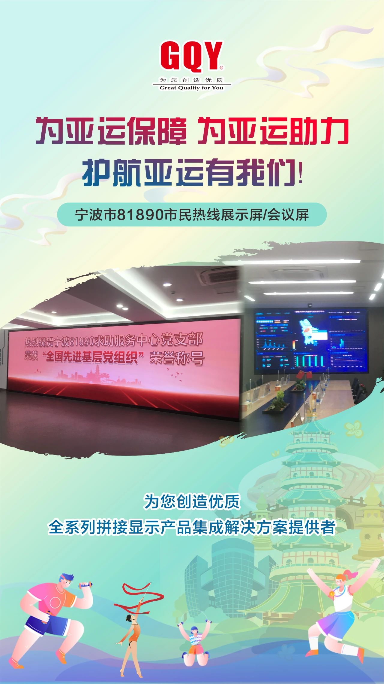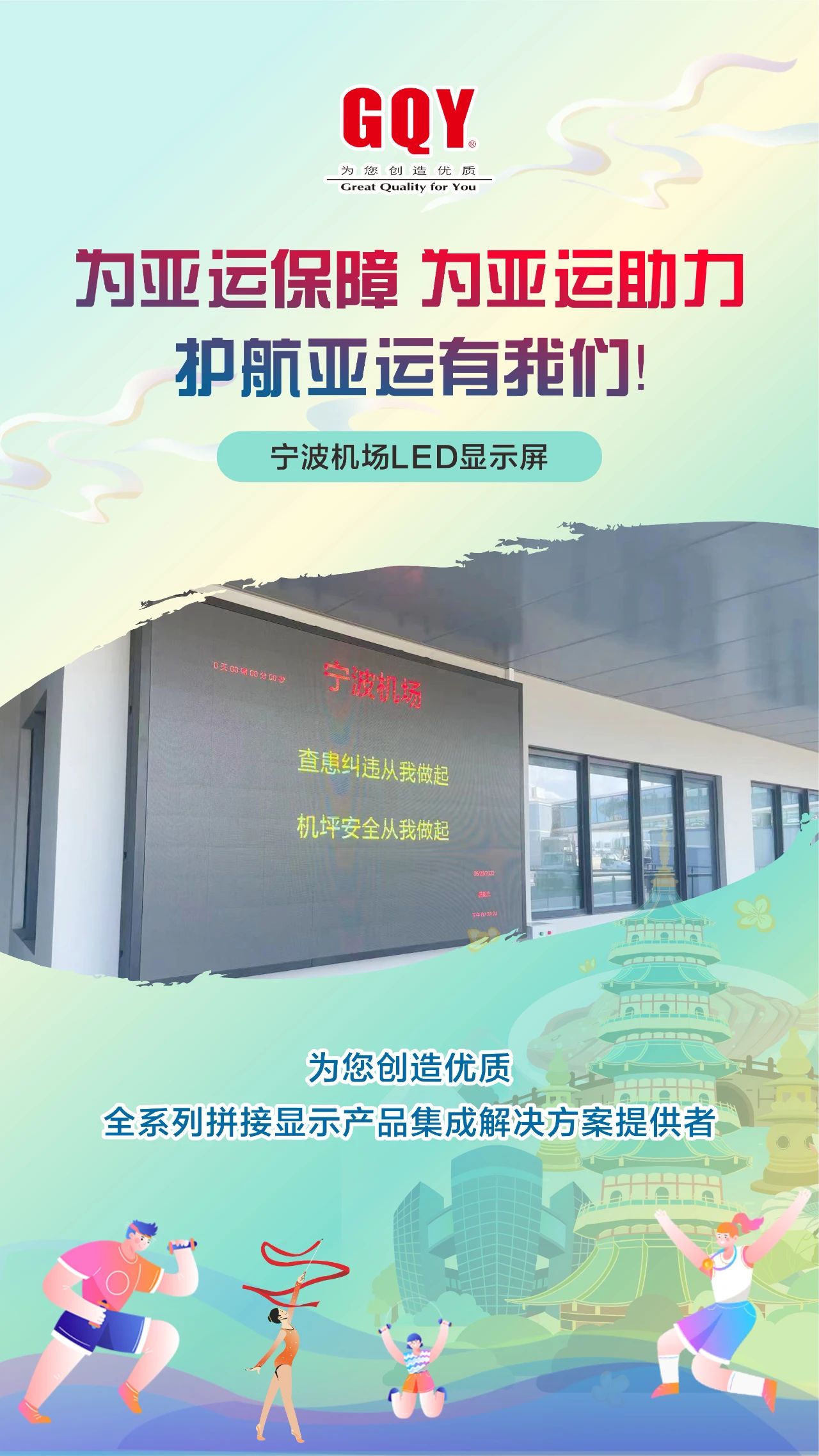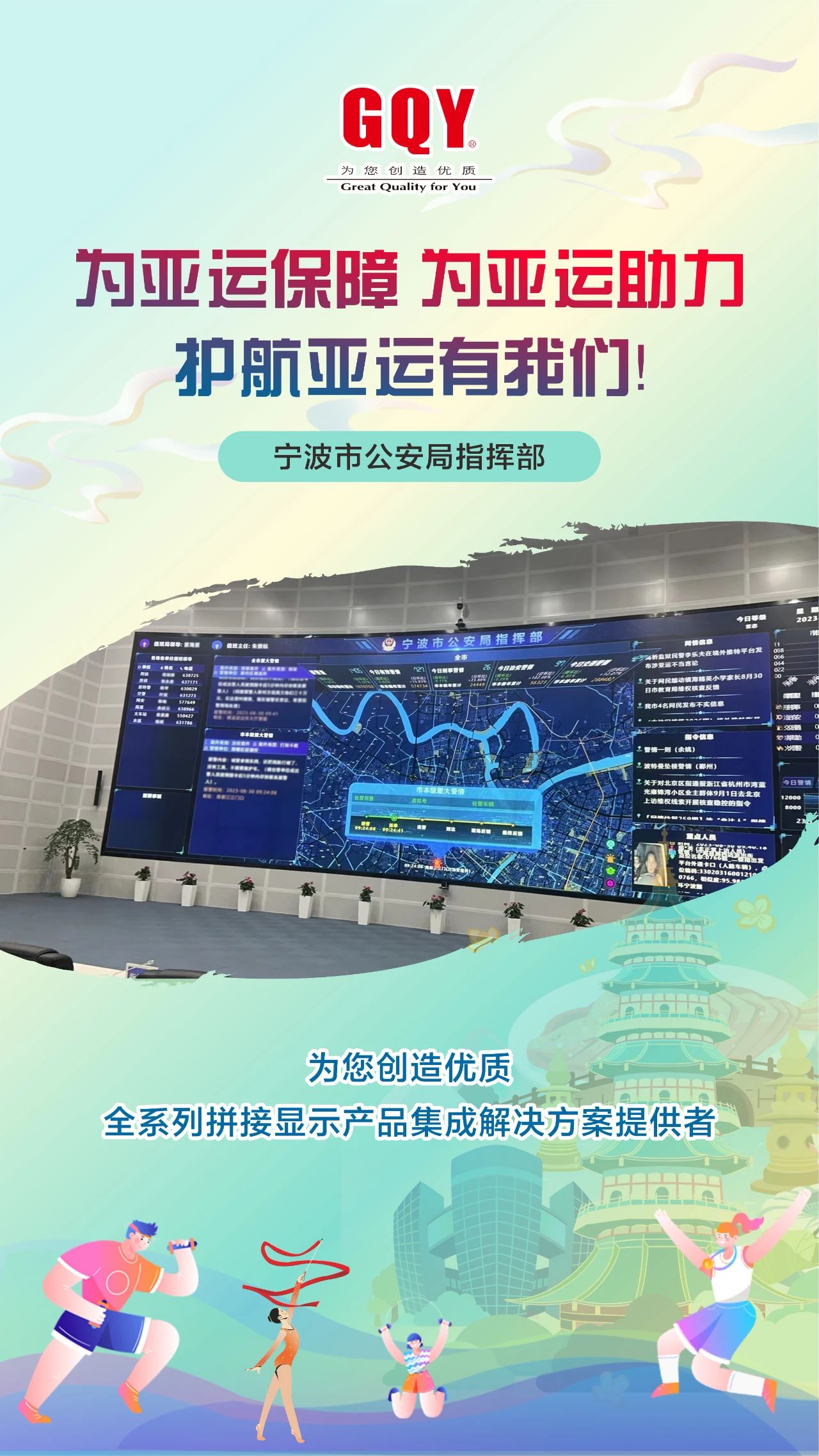 潮涌迎盛會,金秋共亞運(yùn)。象征著亞洲大團(tuán)結(jié)的體育之火在西子湖畔、東海之濱舞動燃起,2023年9月23日,一場萬眾矚目的體育盛會,一場炫目璀璨的文化盛宴在杭州激情開幕。精彩舞臺搭就,八方賓客抵達(dá),杭州,這座千年文化名城在數(shù)智化力量的加持下,正以嶄新的面貌迎接全球賓客。機(jī)場站樓、軌道地鐵、西子湖邊、錢塘江畔、大運(yùn)河旁、街頭巷尾接待了數(shù)以萬計(jì)來自亞洲各地的賓朋、運(yùn)動員、觀眾和游客。作為一家曾為杭州軌道交通、移動通訊、消防安保、城市商顯等各行各業(yè)深度賦能、提供過專業(yè)高清大屏顯示解決方案的視訊企業(yè),GQY視訊護(hù)航助力亞運(yùn)會,在亞運(yùn)會召開期間全力做好后方保障工作。