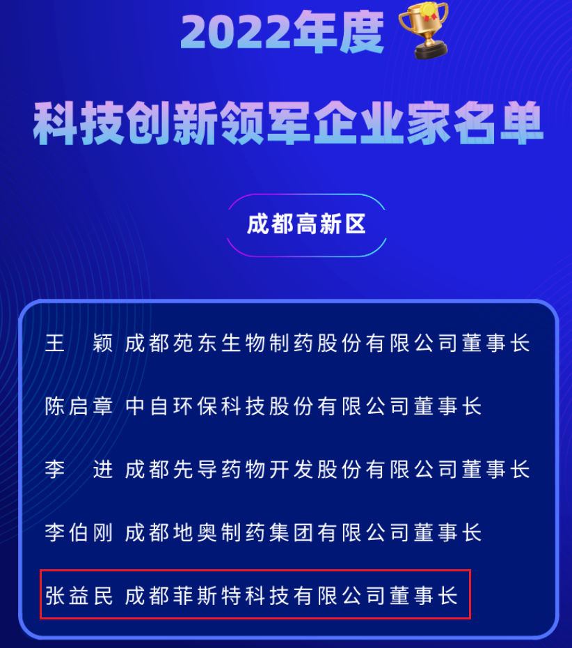 成都菲斯特科技有限公司董事長張益民先生榮獲“四川省科技創(chuàng)新領(lǐng)軍企業(yè)家”稱號!