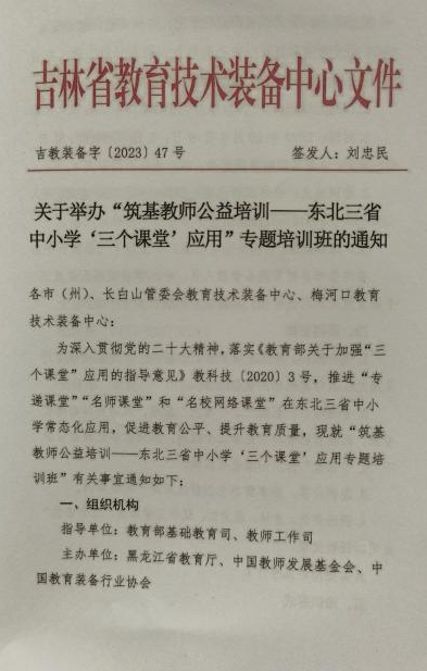 為深入貫徹黨的二十大精神,落實(shí)《教育部關(guān)于加強(qiáng)“三個(gè)課堂”應(yīng)用的指導(dǎo)意見(jiàn)》,推進(jìn)“專遞課堂”、“名師課堂”和“名校網(wǎng)絡(luò)課堂”在廣大中小學(xué)常態(tài)化應(yīng)用,滿足基礎(chǔ)教育階段促進(jìn)教育公平、提升教育質(zhì)量的現(xiàn)實(shí)需求,創(chuàng)新教育教學(xué)模式,推動(dòng)課堂革命,加快推進(jìn)教育現(xiàn)代化,由黑龍江省教育廳、中國(guó)教師發(fā)展基金會(huì)、中國(guó)教育裝備行業(yè)協(xié)會(huì)主辦,黑龍江教師發(fā)展學(xué)院、吉林省教育技術(shù)裝備中心、遼寧教育學(xué)院承辦,黑龍江省教育裝備行業(yè)協(xié)會(huì)協(xié)辦的“筑基教師公益培訓(xùn)”—東北三省中小學(xué)“三個(gè)課堂”應(yīng)用專題培訓(xùn)會(huì)議于2023年10月9日在哈爾濱市舉行。希沃多部門提供專遞課堂案例展示支持。