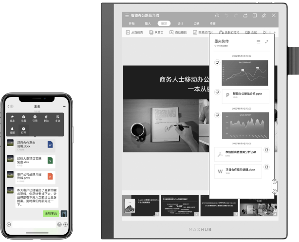 只需要在電腦端打開網(wǎng)頁,就可以實(shí)現(xiàn)智能辦公本和電腦端的資料雙向互傳。微信聊天中的圖片、文檔、甚至PPT,都能直接分享到辦公本上,閱讀和批注都更便捷。