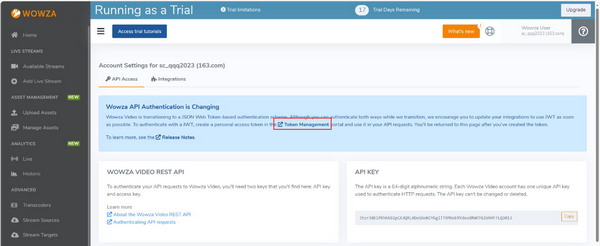 2、在“Wowza API Authentication is Changing”的介紹中,點(diǎn)擊“Token Management”跳轉(zhuǎn)鏈接。