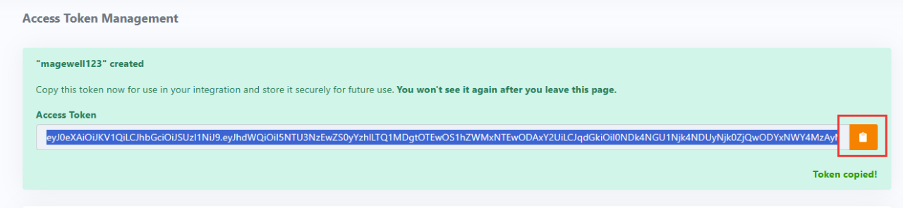 系統(tǒng)會(huì)自動(dòng)生產(chǎn)一個(gè)“Access Token”,點(diǎn)擊右側(cè)復(fù)制圖標(biāo),即可復(fù)制該Token。