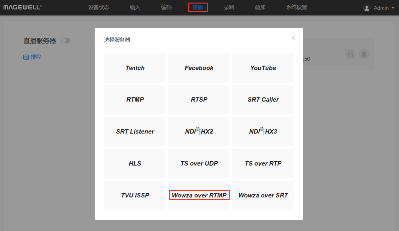 4、登錄Ultra Encode AIO的WebUI,進(jìn)入“Live”頁簽,添加直播服務(wù)器,在彈出的頁面中,可以選擇Wowza over RTMP(Ultra Encode AIO目前支持Wowza over RTMP和SRT,本文以Wowza over RTMP舉例)。