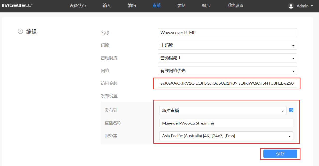 5、粘貼Token到“Token”輸入框內(nèi),在“Publish settings”中選擇需要將流推流到的Wowza平臺(tái)中已創(chuàng)建的通道任務(wù),或者直接新建通道任務(wù)。如下方新建了一個(gè)名為“Magewell-Wowza Streaming”的通道任務(wù),然后點(diǎn)擊“Save”。