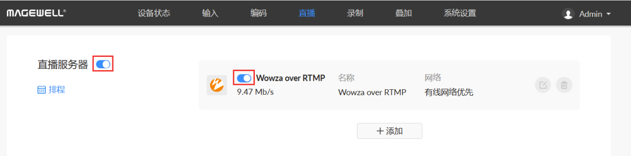 6、打開“Wowza over RTMP”和“直播服務(wù)器”直播開關(guān)按鈕。