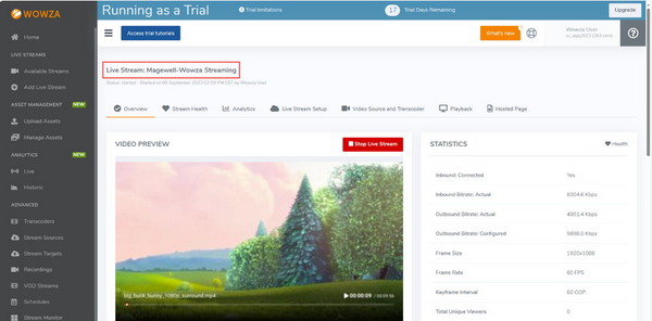 7、返回Wowza平臺(tái),可以看到已經(jīng)名為“Magewell-Wowza Streaming”的流任務(wù),并且推流成功。