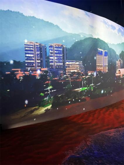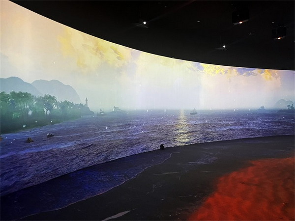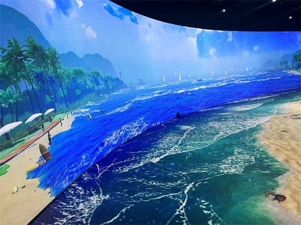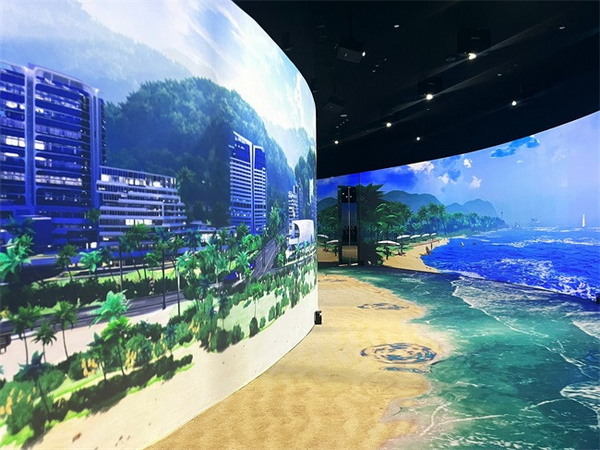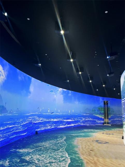 影片內(nèi)容以介紹小梅沙國際都市和山海自然風(fēng)光為主,外弧墻面通過投影機(jī)營造出了一幅人們嬉戲海洋的畫面,生動(dòng)的人物、海鷗和帆船在精美的投影下顯得栩栩如生,曲線的建筑造型拉大了天際和海面的視覺空間,配合著地面的海浪和沙灘的投影,一個(gè)超具沉浸感與現(xiàn)實(shí)感的海邊場(chǎng)景呈現(xiàn)在人們面前;內(nèi)弧墻面上一幢幢充滿未來感與科技感的建筑群在連綿不斷的山間聳立,山海相望,海灘相連,一幅充滿自然、活力與時(shí)尚的小梅沙地區(qū)的畫像通過投影生動(dòng)地躍入眼簾。