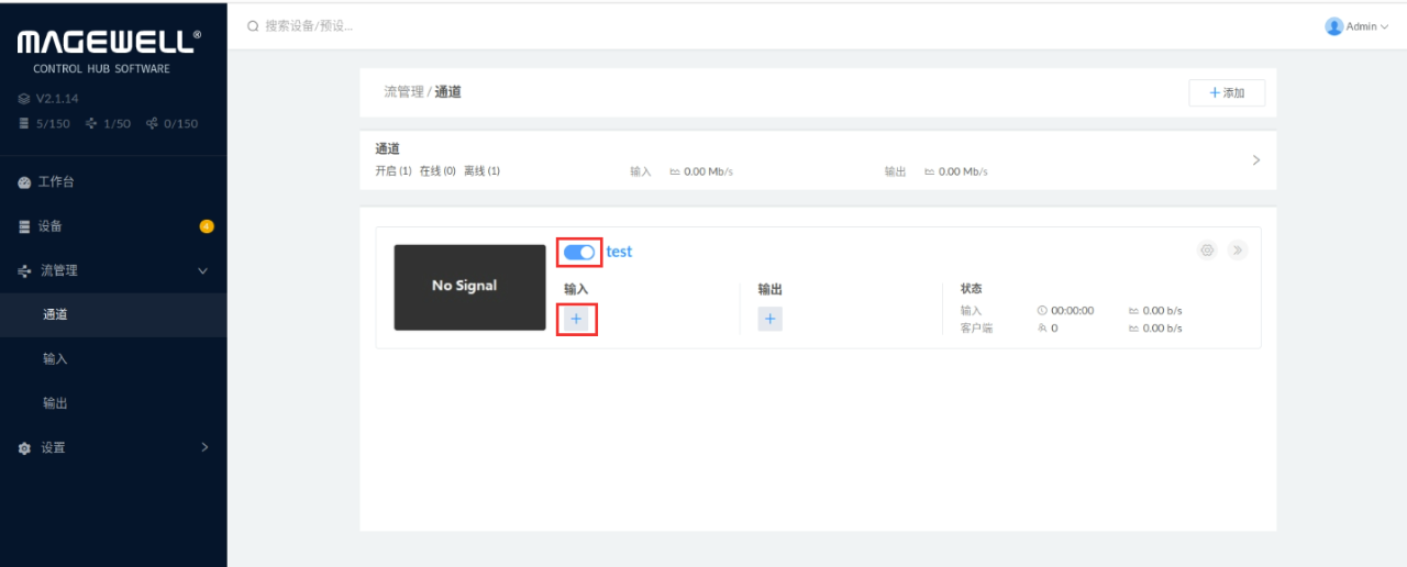 打開通道開關(guān),點(diǎn)擊輸入的“+”,進(jìn)入通道信號(hào)輸入頁面。