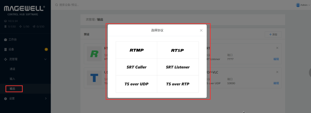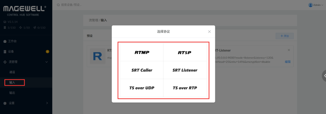 對(duì)于沒有注冊(cè)到美樂威的Ultra Stream, Ultra Encode系列編碼器和第三方的編碼器。用戶可以在“輸入”頁簽里面,先添加預(yù)設(shè),選擇多種協(xié)議。