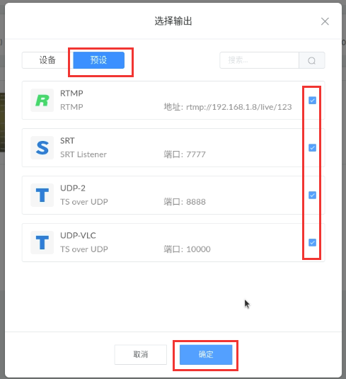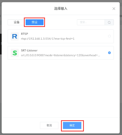 添加完預(yù)設(shè)后,在“選擇輸入”中選擇“預(yù)設(shè)”,勾選剛才預(yù)設(shè)的SRT或RTSP作為通道信號(hào),點(diǎn)擊“確定”即可。