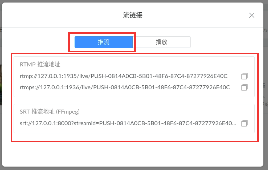 在彈出的頁面中,點(diǎn)擊“推流”,會(huì)提供RTMP和SRT的Stream URL,并自動(dòng)生成鏈接,用戶可以點(diǎn)擊右側(cè)復(fù)制按鈕,粘貼到編碼器中,這樣編碼器就可以推流到通道中作為信號(hào)輸入。