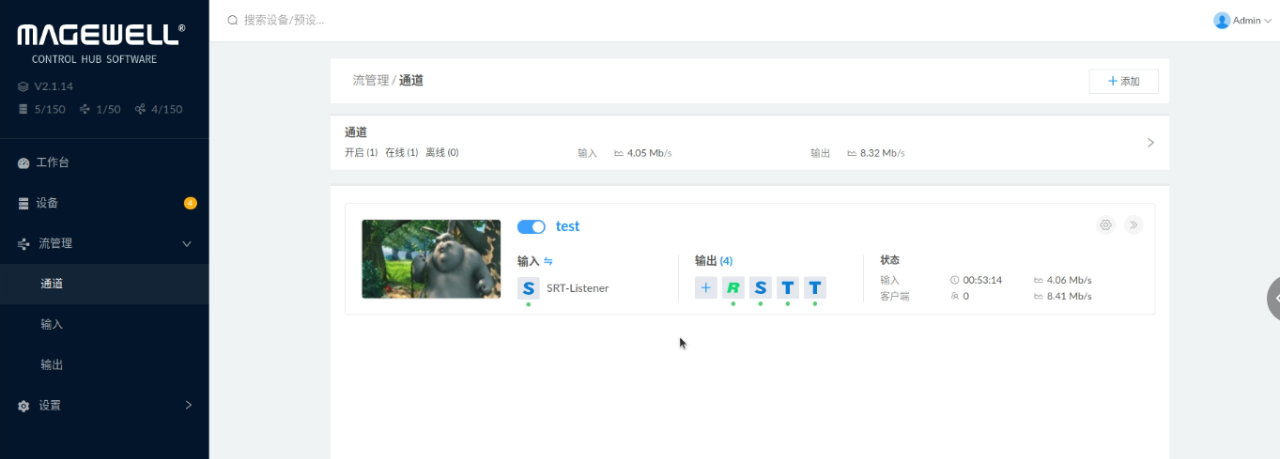 4、設(shè)置好通道的輸入和輸出,可以看到通道運(yùn)行狀態(tài)。