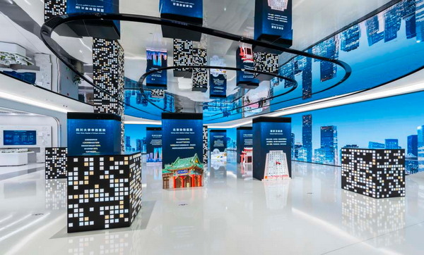 在展廳中庭,高清LED立柱四面屏、弧形屏和展廳內(nèi)部空間構(gòu)造相得益彰,以數(shù)字化方式生動地再現(xiàn)了華為在智慧醫(yī)療、智慧教育等領(lǐng)域的落地應(yīng)用及實(shí)踐成果,極具視覺沖擊力,也讓整個展廳更具科技感、互動性。