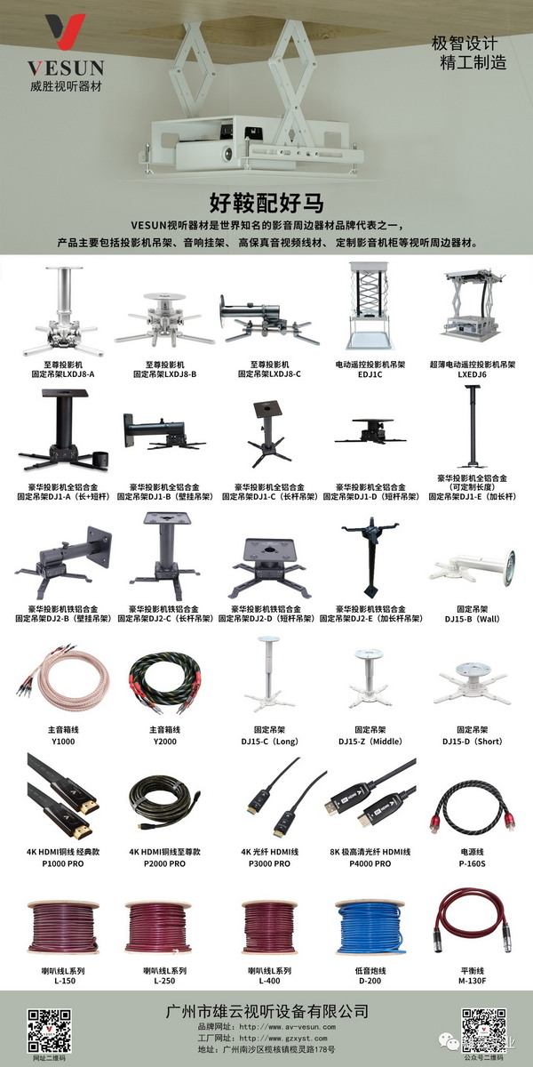 雄云(智能·影音·視聽)體系旗下?lián)碛卸嗉疑a(chǎn)制造型企業(yè):雄云(廣東)視聽科技有限公司;廣州市雄云視聽設(shè)備有限公司;廣州市雄瑞投影幕制造有限公司。主營產(chǎn)品業(yè)務(wù):教育設(shè)備、音響、投影機、吊架、機柜、投影幕、音視頻線材等視聽設(shè)備和影音器材;并承接影音系統(tǒng)、會議視訊系統(tǒng)、多媒體教育系統(tǒng)、智慧校園系統(tǒng)、家庭影院、影院影劇院、客廳大屏影院、影吧影K、智能家居、智能安防等解決方案項目。