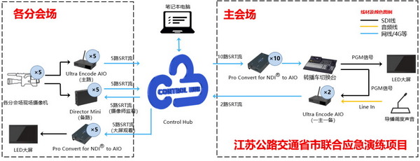 此外,主會(huì)場PGM信號(hào)嵌入導(dǎo)播老師的實(shí)時(shí)調(diào)度聲音后,通過2臺(tái)Ultra Encode AIO(一主一備)編碼盒,經(jīng)由Control Hub發(fā)送10路SRT流給2個(gè)分會(huì)場內(nèi)的Pro Convert解碼器和Director Mini導(dǎo)播推流一體機(jī)。其中,Pro Convert for NDI® to AIO解碼輸出的信號(hào)供分會(huì)場與會(huì)代表觀看,Director Mini解碼畫面供攝像師觀看,并監(jiān)聽導(dǎo)播老師實(shí)時(shí)調(diào)度聲音。整個(gè)活動(dòng)期間,主會(huì)場和各分會(huì)場都可清晰地看到對方輸出的信號(hào),畫面流暢穩(wěn)定,音畫同步,整場活動(dòng)受到了省交通運(yùn)輸廳等相關(guān)單位的一致好評(píng)。