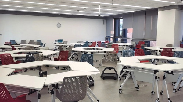 區(qū)別于傳統(tǒng)教室的排排坐,分組研討型錄播教室采用了圓桌模式,以小組形式展開課堂教學(xué),課程更重視學(xué)生主體,以討論式教學(xué)啟發(fā)學(xué)生的思維。