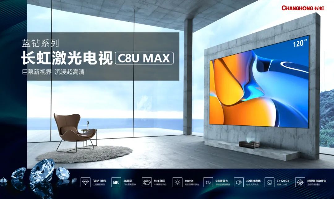 2023年8月,高亮激光電視C8U MAX上市,擁有400nit亮度,支持8K影像解碼,以更高清、更亮麗的畫質讓用戶沉浸巨幕觀影新感官。