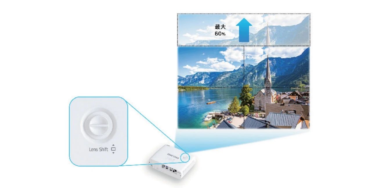 除了1.6x高倍鏡頭以外,理光PJ RU220還配置了垂直60%寬幅鏡頭位移,能夠突破安裝環(huán)境的限制,大幅提升安裝位置的自由度,這一點(diǎn)對于多樣化的辦公環(huán)境而言是非常不錯的改變。