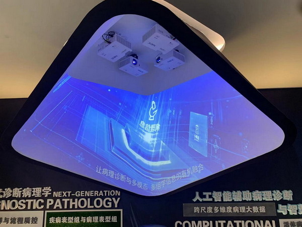 對(duì)于病理的研究,不光是應(yīng)用在當(dāng)下臨床醫(yī)學(xué),未來(lái)遠(yuǎn)程診斷發(fā)揮空間更廣。在下一代診斷病理學(xué)區(qū)域,可以看到傘形環(huán)繞腔體內(nèi)展示著實(shí)驗(yàn)室關(guān)于人工智能輔助病理診斷的最新研究成果,將病理、影像、組學(xué)與臨床信息交叉融合,組成多維度病理大數(shù)據(jù)。腔體內(nèi)采用4臺(tái)NEC騎士系列投影機(jī)CS3300WL ,4000流明亮度,0.52投射比的短焦鏡頭,打破空間狹小限制,短距離即可投出大畫(huà)面。此外CS3300WL支持360度安裝,搭配豐富幾何校正功能,安裝更加便捷。小巧機(jī)身完美“隱藏”在腔體內(nèi),打造沉浸體驗(yàn)空間。