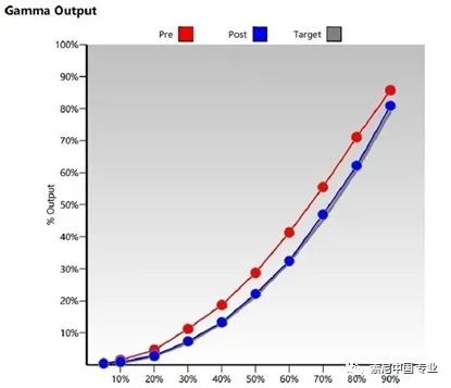 (2)Gamma調(diào)整:默認Gamma偏低,設(shè)置為2.6才接近參考值2.2。調(diào)準Gamma 后亮度輸出曲線也挺準,緊貼目標值。