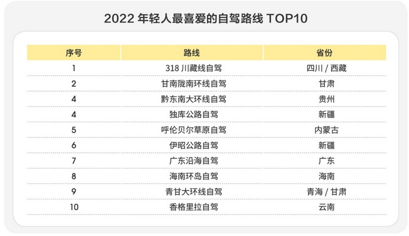 與此同時,租車出游的占比也逐步增高。能夠隨時停下來欣賞未知美景,也是年輕人旅途中的樂趣所在。關(guān)于客源地的數(shù)據(jù)統(tǒng)計顯示,80.7%的自駕游用戶選擇1-8天的中短途自駕線路。幾乎每位自駕愛好者都渴望體驗的“318川藏線自駕”是2022年輕人最喜愛的自駕路線,“甘南隴南環(huán)線自駕”、“ 黔東南大環(huán)線”分列二、三名,每年只有限定期間開放的獨庫公路也躋身前五。