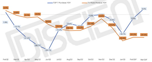 需求端:雖然Q1處于傳統(tǒng)淡季,但此前由于面板價(jià)格處于下行通道,部分品牌和代工廠采取嚴(yán)控庫存的謹(jǐn)慎采購策略,庫存水位相對(duì)健康,而國內(nèi)618備貨節(jié)點(diǎn)臨近以及北美部分補(bǔ)貨需求提前釋放,在原本Q2價(jià)格可預(yù)見性上漲的背景下,部分品牌及代工廠基于策略采購和訂單回暖的考量開始提前增加采購物量,從DISCIEN(迪顯)統(tǒng)計(jì)數(shù)據(jù)來看,雖然TOP7 2月采購總量同比減少3.5%,但3月采購總量同比已轉(zhuǎn)向正增長,增幅達(dá)到5.4%。