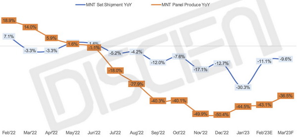 圖三:MNT面板產(chǎn)出與品牌出貨同比走勢(shì)