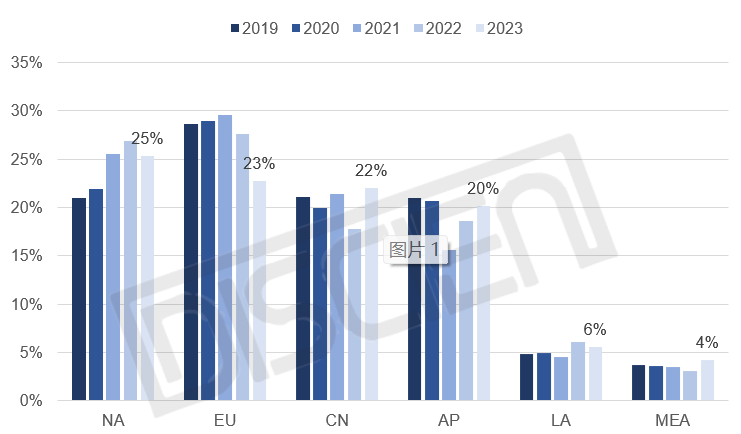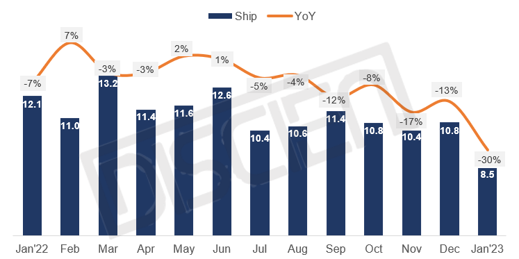 歐洲(EU):1月出貨1.9M,同比減少43%。22年爆發(fā)俄烏戰(zhàn)爭的后續(xù)影響仍在持續(xù)。歐洲通脹高企及PMI指數(shù)低于榮枯線,導(dǎo)致該區(qū)域B2B/B2C市場需求處于收縮態(tài)勢。弱勢的經(jīng)濟環(huán)境使MNT等消費電子出貨量大幅下滑,全球出貨占比從之前三成以上降至23%。