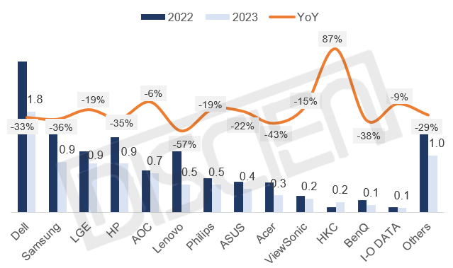 LGE(樂金):1月出貨0.9M,同比下滑19%,排名第三。LGE主要市場為歐美以及亞太市場。雖然顯示器品牌整體都不同程度受到大環(huán)境影響,但LGE在23.8”/27”的支撐下,下滑幅度較小,排名首次進入第三。