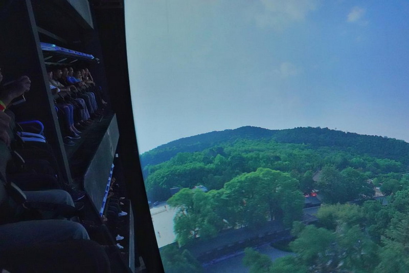 “奇幻翱翔”影院,則用NEC 4萬流明投影機(jī)通過魚眼鏡頭投射出23米×17米巨大半球銀幕,為游客模擬出逼真的飛行體驗(yàn)。在機(jī)械手臂提起的懸空座椅上,游客們以居高臨下的超廣俯視視角,領(lǐng)略一場(chǎng)奇妙的滑翔之旅。