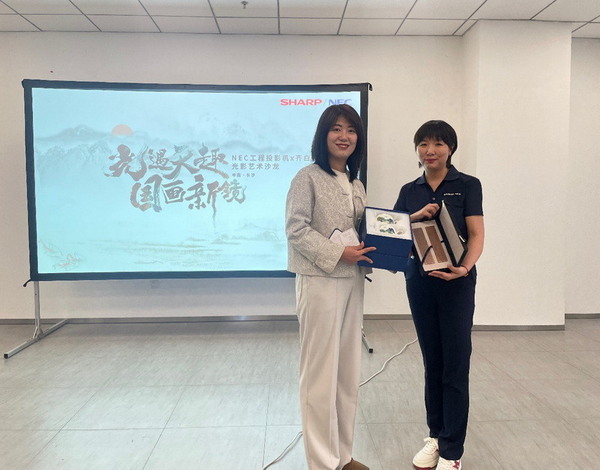 沙龍尾聲,NEC工程投影機全國銷售總監(jiān)譚慧菊女士與北京畫院王亞楠老師互贈禮物,強調(diào)了此次合作的戰(zhàn)略意義與深遠(yuǎn)影響,同時也傳遞出未來雙方將持續(xù)深入探索更多傳統(tǒng)文化光影化的合作,將藝術(shù)+科技的融合推向新高度。