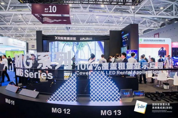 今年在展位的C位,依然是MG系列的租賃舞臺應用展示。它由吊裝、主屏、地磚屏組成,均采用MG7S系列,由常規(guī)箱體、創(chuàng)意延伸系列以及45°切角箱體組合搭建而成,充分展示了MG7S系列的“一屏通用、一屏百變”的獨特性能,可100%覆蓋LED顯示屏租賃應用。